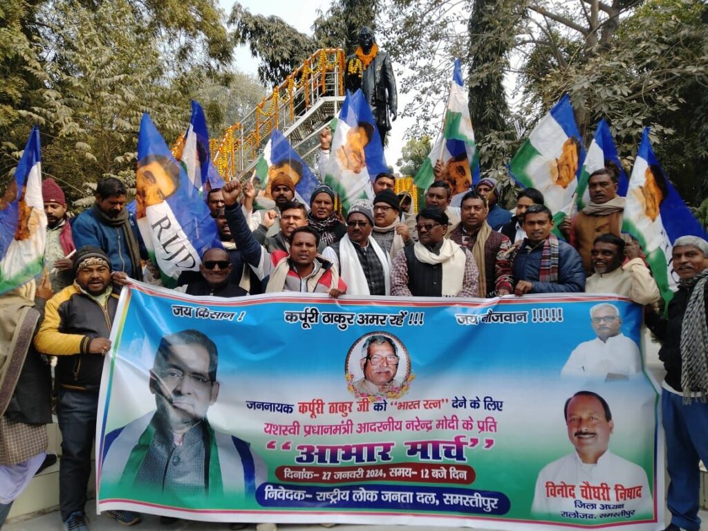 बिहार के पूर्व मुख्यमंत्री जननायक कर्पूरी ठाकुर को भारत रत्न दिये जाने से हर तरफ हर्ष व्याप्त है. शनिवार को समस्तीपुर में राष्ट्रीय लोक जनता दल के द्वारा पार्टी के राज्यव्यापी कार्यक्रम के तहत आभार मार्च निकाला गया. पार्टी कार्यकर्ताओं ने इस मार्च के जरिये प्रधानमंत्री नरेन्द्र मोदी जी की प्रति आभार व्यक्त किया.