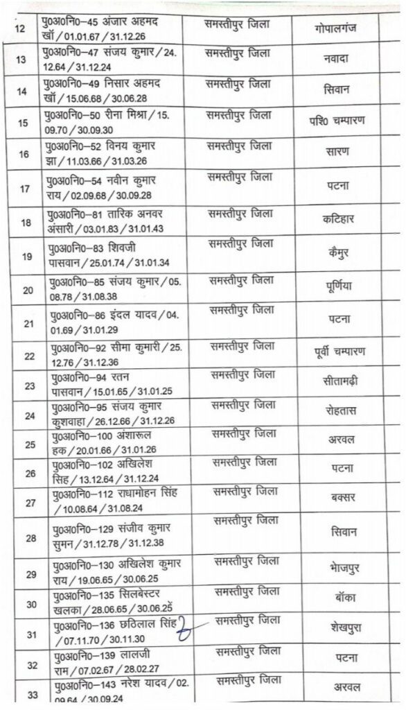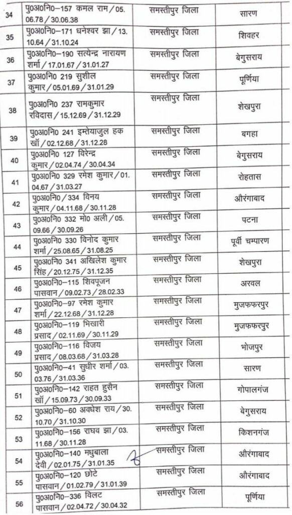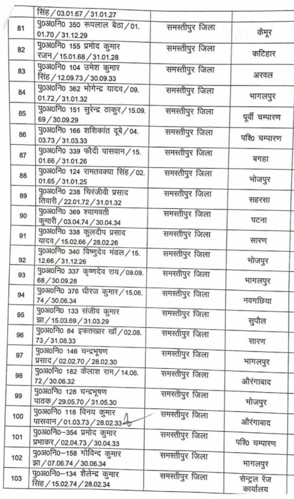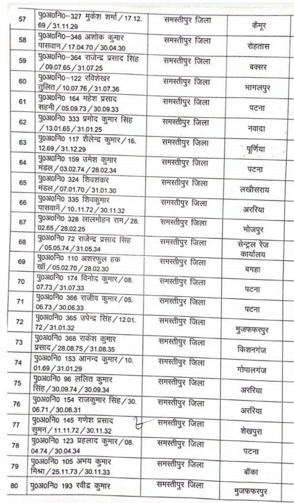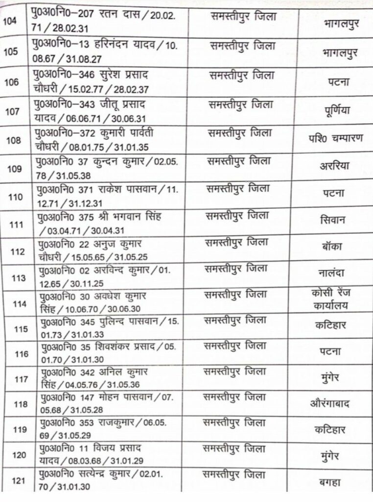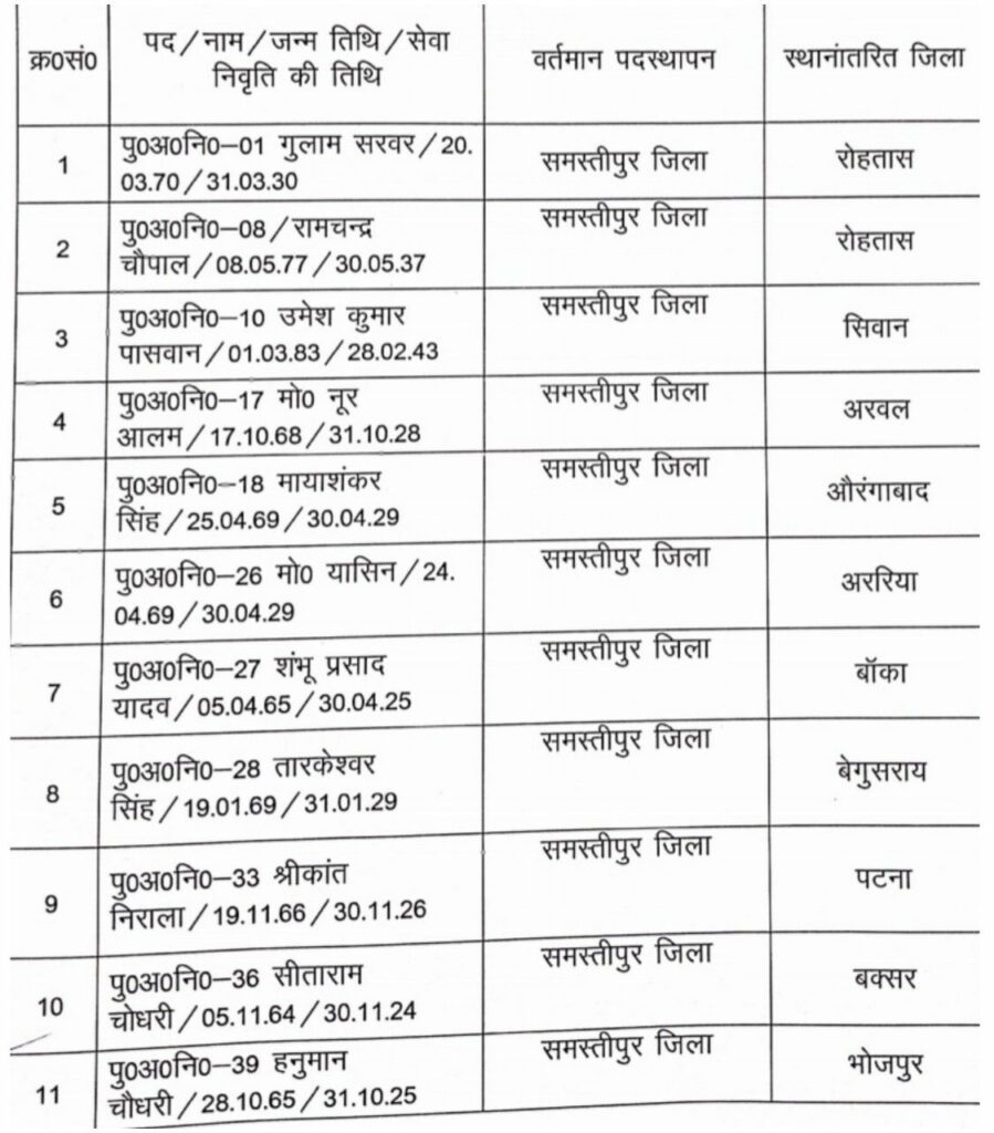 बिहार पुलिस मुख्यालय स्तर पर गठित स्थानांन्तरण समिति की 23 जनवरी को हुई बैठक में लिए गए निर्णय पर यह कार्रवाई की गई है. स्थानांतरित किये गए सभी पुलिस कर्मियों को 05 फरवरी तक नवपदस्थापन जिला इकाई में योगदान देने का निर्देश दिया गया है. उन्हें 01 फरवरी से विरमित किया गया है एवं जिला से सभी पंजियों से नाम विलोपित करने का आदेश दिया गया है.