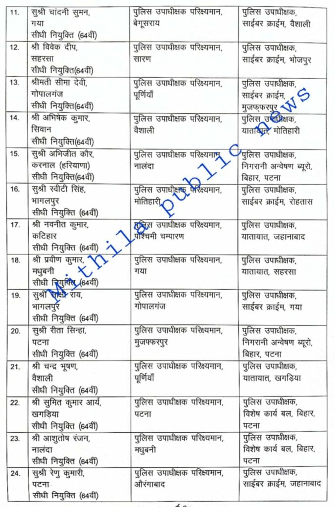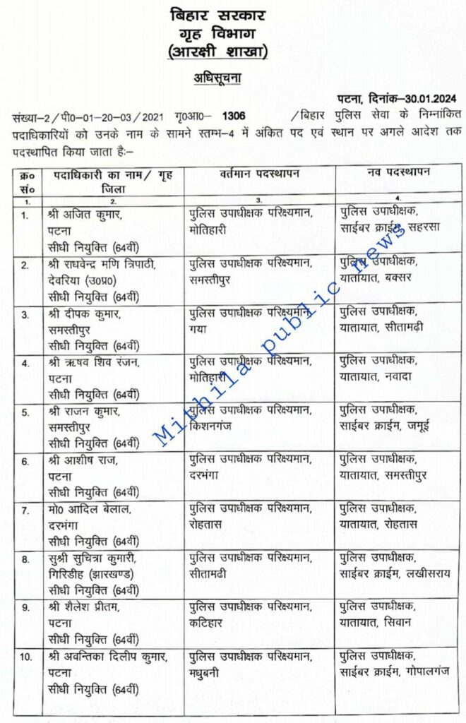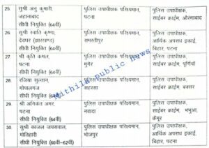 बिहार पुलिस सेवा के 30 प्रशिक्षयमान पुलिस उपाधीक्षकों की विभिन्न जिलों में पोस्टिंग की गई है. जिसमें दरभंगा में तैनात प्रशिक्षयमान पुलिस उपाधीक्षक आशीष राज को समस्तीपुर में यातायात का डीएसपी बनाया गया है. वहीं समस्तीपुर में प्रशिक्षयमान डीएसपी स्वाति कृष्णा को आर्थिक अपराध इकाई (इओयू) में पुलिस उपाधीक्षक के रूप में पदस्थापित किया गया है. स्वाति कृष्णा वर्तमान में मुफस्सिल थानाध्यक्ष के रूप में पदस्थापित थीं. जबकि राघवेंद्र मणि त्रिपाठी को बक्सर जिले में यातायात का डीएसपी बनाया गया है.