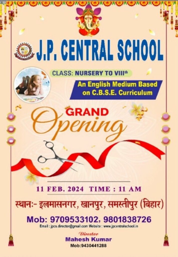 समस्तीपुर के श्रेष्ठ शिक्षण संस्थानों में गिने जाने वाले जेपी सेंट्रल स्कूल के एक और नये शाखा का उद्घाटन 11 फरवरी को समारोहपूर्वक किया जायेगा। उदघाटन समारोह की सारी तैयारियां पूरी कर ली गई है। इस नये शाखा का निर्माण खानपुर प्रखंड के इलमासनगर पेट्रोल पंप के समीप किया गया है।