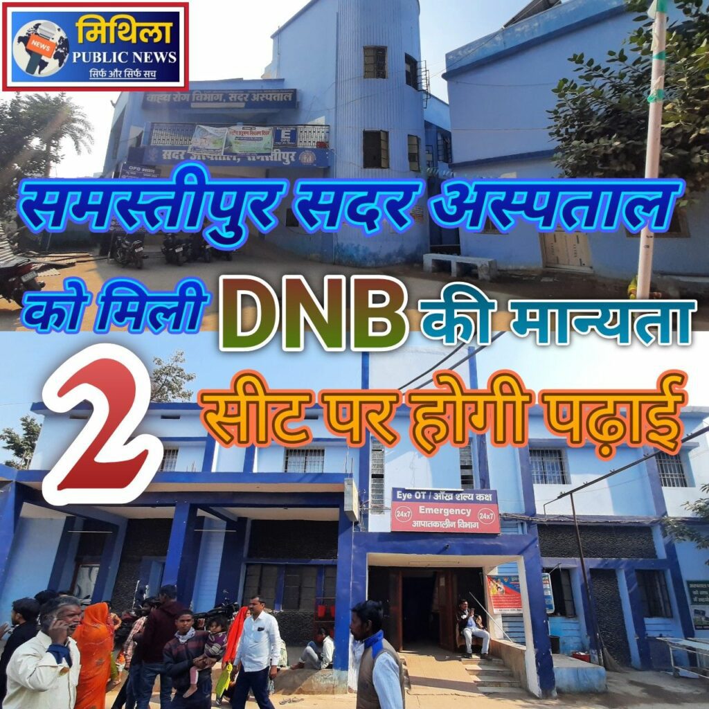 समस्तीपुर सदर अस्पताल सहित राज्य के दो अस्पतालों को DNB की मान्यता मिली है। राज्य में डीएनबी की पढ़ाई के लिए मान्यता मिलने वाले अस्पतालों की संख्या अब 5 हो गयी है। पूर्व से तीन अस्पतालों क्रमशः मोतिहारी सदर अस्पताल में 6 सीट, सीतामढ़ी में 2 और एलएनजेपी हड्डी अस्पताल में 4 सीट के लिए डीएनबी की सुविधा उपलब्ध थी।