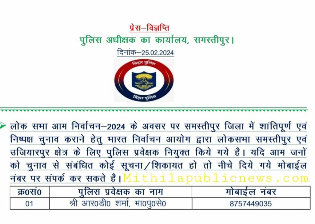 समस्तीपुर पुलिस के सोशल मीडिया प्लेटफार्म पर प्रेस विज्ञप्ति जारी कर इसकी जानकारी दी गई है। जिसमें कहा गया है कि शांतिपूर्ण एवं निष्पक्ष चुनाव कराने के लिए भारत निर्वाचन आयोग द्वारा लोकसभा समस्तीपुर एवं उजियारपुर क्षेत्र के लिए पुलिस पर्यवेक्षक नियुक्त किये गये हैं।