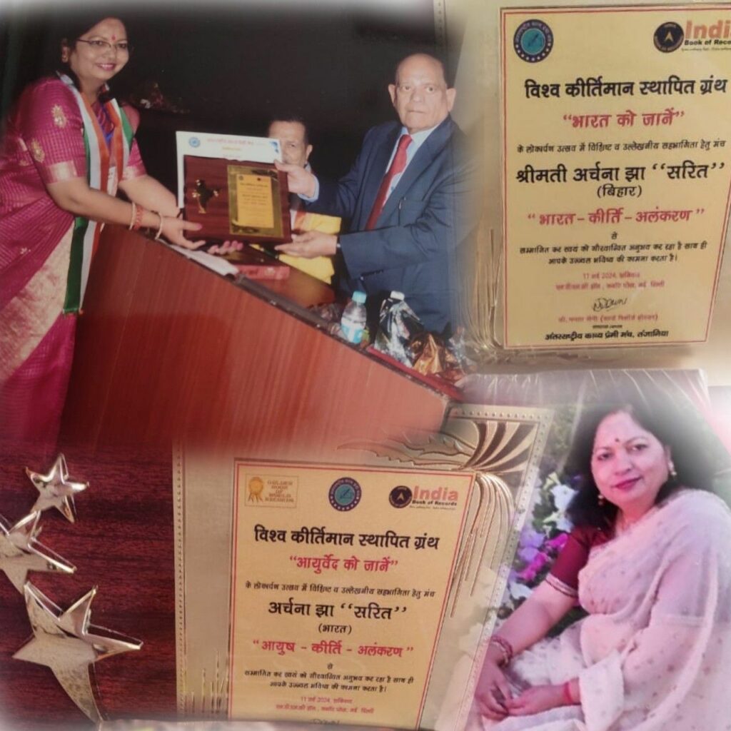 अर्चना झा उर्फ अर्चना झा ‘सरित’ को इंडिया बुक ऑफ रिकॉर्ड में शामिल डॉ ममता सैनी की किताब “आयुर्वेद को जानें” में पलाश पर 55 दोहे लिखने के लिए ‘आयुष कृति अलंकरण’ एवं “भारत को जानें” में बिहार पर गीत लेखन के लिए ‘भारत कृति अलंकरण’ सम्मान से सम्मानित किया गया है। मिथिला पब्लिक न्यूज से खास बातचीत में उन्होंने बताया कि इसी महीने 11 मई को नई दिल्ली के एनडीएमसी कन्वेंशन हॉल में अंतर्राष्ट्रीय काव्य प्रेमी मंच तंजानिया द्वारा सम्मान समारोह का आयोजन किया गया था।