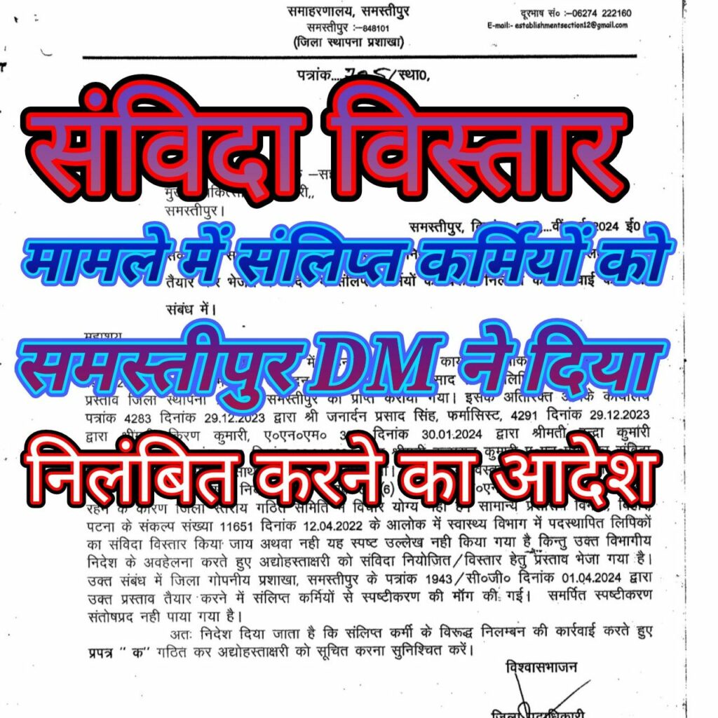 समस्तीपुर में लिपिक एवं एएनएम का अवैध रूप से संविदा विस्तार करने के मामले को जिलाधिकारी ने गंभीरता से लिया है। स्वास्थ्य विभाग में की गयी इस गड़बड़ी में लिप्त कर्मियों जिलाधिकारी योगेंद्र सिंह ने निलंबित करने का आदेश दिया है। साथ ही साथ उनपर प्रपत्र ‘क’ गठित कर इसकी रिपोर्ट देने का भी आदेश दिया गया है।