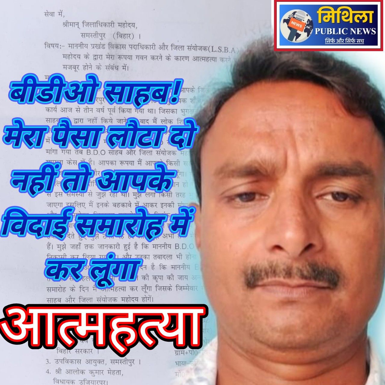वे तीन वर्ष से इस समस्या से जुझ रहे थे। इसलिए रूपया मिलने की उम्मीद में उन्होंने 08 मार्च 2024 को समस्या का समाधान हो जाने की बात लिख कर दे दी। लेकिन उसके बाद से आरोपी किसी-किसी बहाने से मामले को उलझाते आ रहे हैं। इधर रुपया निकासी हो जाने की आशंका और उक्त बीडीओ के तबादला होने की सूचना से उनका लाखों रुपया डूबता हुआ नजर आ रहा है। जिससे डरकर संवेदक ने जिलाधिकारी से लेकर ग्रामीण विकास विभाग के प्रधान सचिव एवं सरकार के मुख्य सचिव तक इसकी शिकायत की है। इतना ही नहीं पीड़ित संवेदक ने उक्त बीडीओ के तबादला होने तक न्याय नहीं मिलने पर आत्महत्या कर लेने की धमकी भी दी है। संवेदक ने कहा है कि बीडीओ के तबादले पर होने वाले विदाई समारोह के दिन वह आत्महत्या कर लेगा।