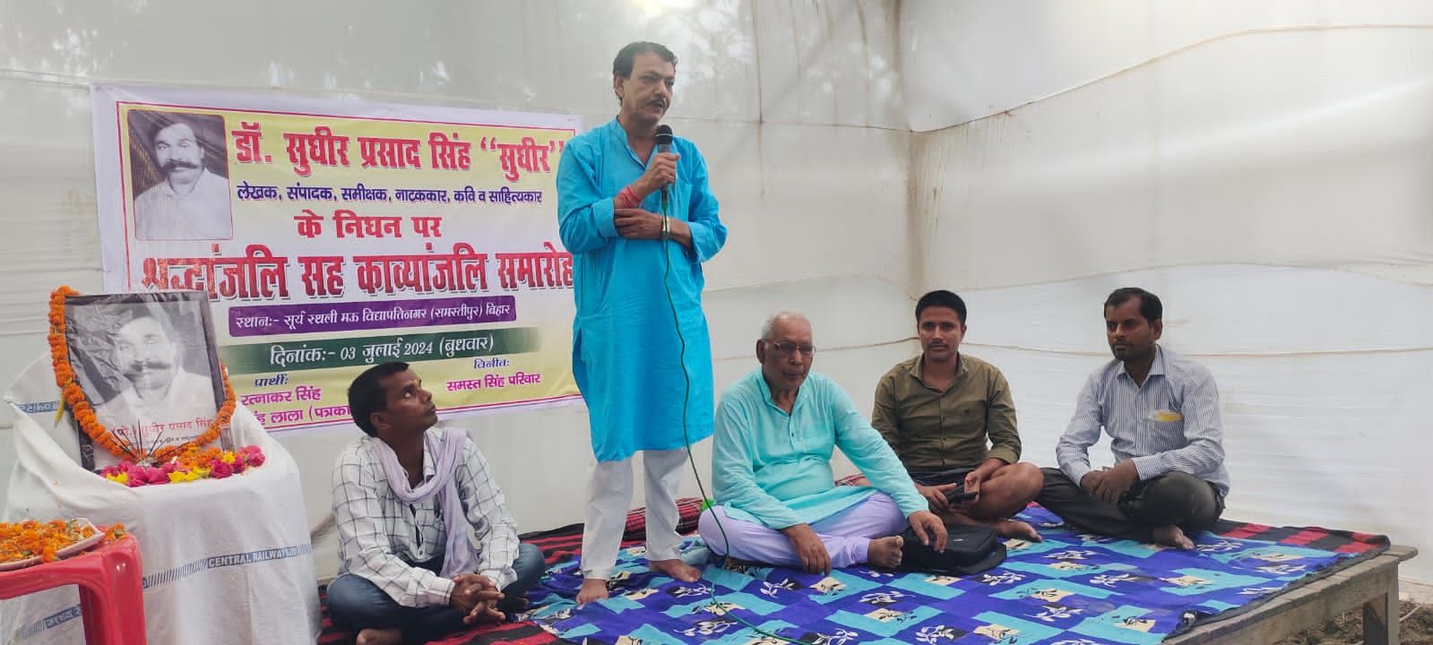 विद्यापतिनगर प्रखंड के सूर्यस्थली मऊ परिसर में तरूण सांस्कृतिक चेतना समिति व यूथ ब्रिगेड टीम की ओर से बुधवार की शाम श्रद्धांजलि सह काव्यांजलि का आयोजन किया गया। इस कार्यक्रम का आयोजन कर लेखक, संपादक, समीक्षक, नाटककार कवि व साहित्यकार डॉ सुधीर प्रसाद सिंह “सुधीर” को उनके असामयिक निधन पर श्रद्धांजलि दी गयी।