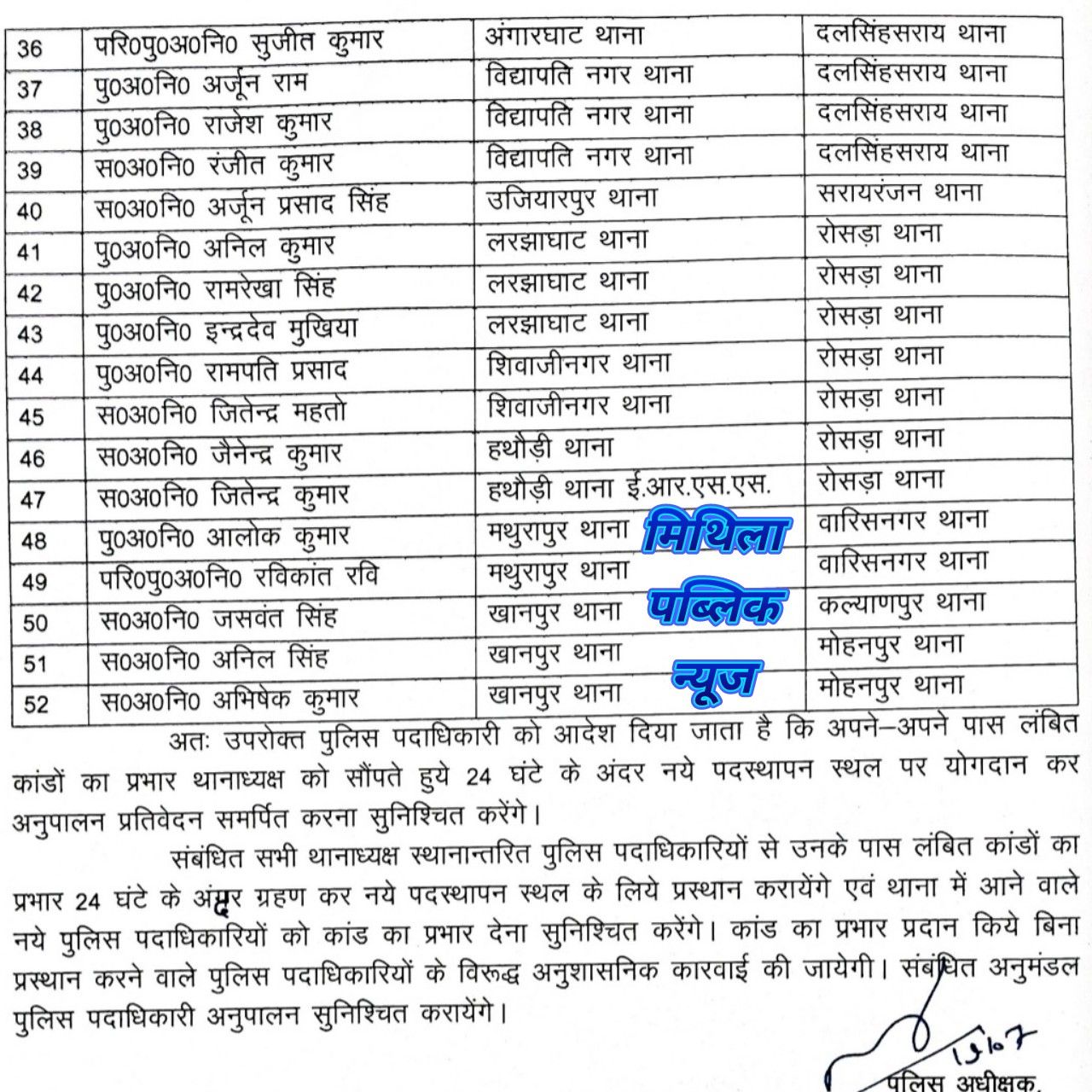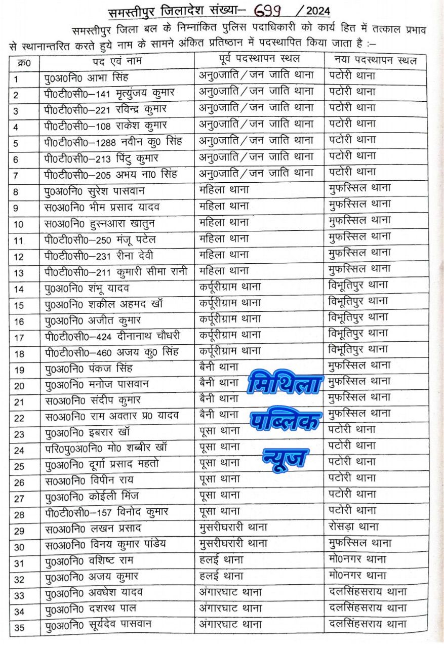इसमें एससीएसटी थाना में पदस्थापित पुअनि आभा सिंह के साथ साथ पीटीसी मृत्युंजय कुमार, रविंद्र कुमार, राकेश कुमार, नवीन कुमार सिंह, पिंटू कुमार एवं अभय नारायण सिंह को पटोरी थाना में तैनात किया गया है। महिला थाना में पदस्थापित पुअनि सुरेश पासवान एवं सअनि भीम प्रसाद यादव एवं हुस्न आरा खातून के साथ साथ पीटीसी मंजू पटेल, रीना देवी एवं कुमारी सीमा रानी को मुफस्सिल थाना में स्थानांतरित किया गया है।