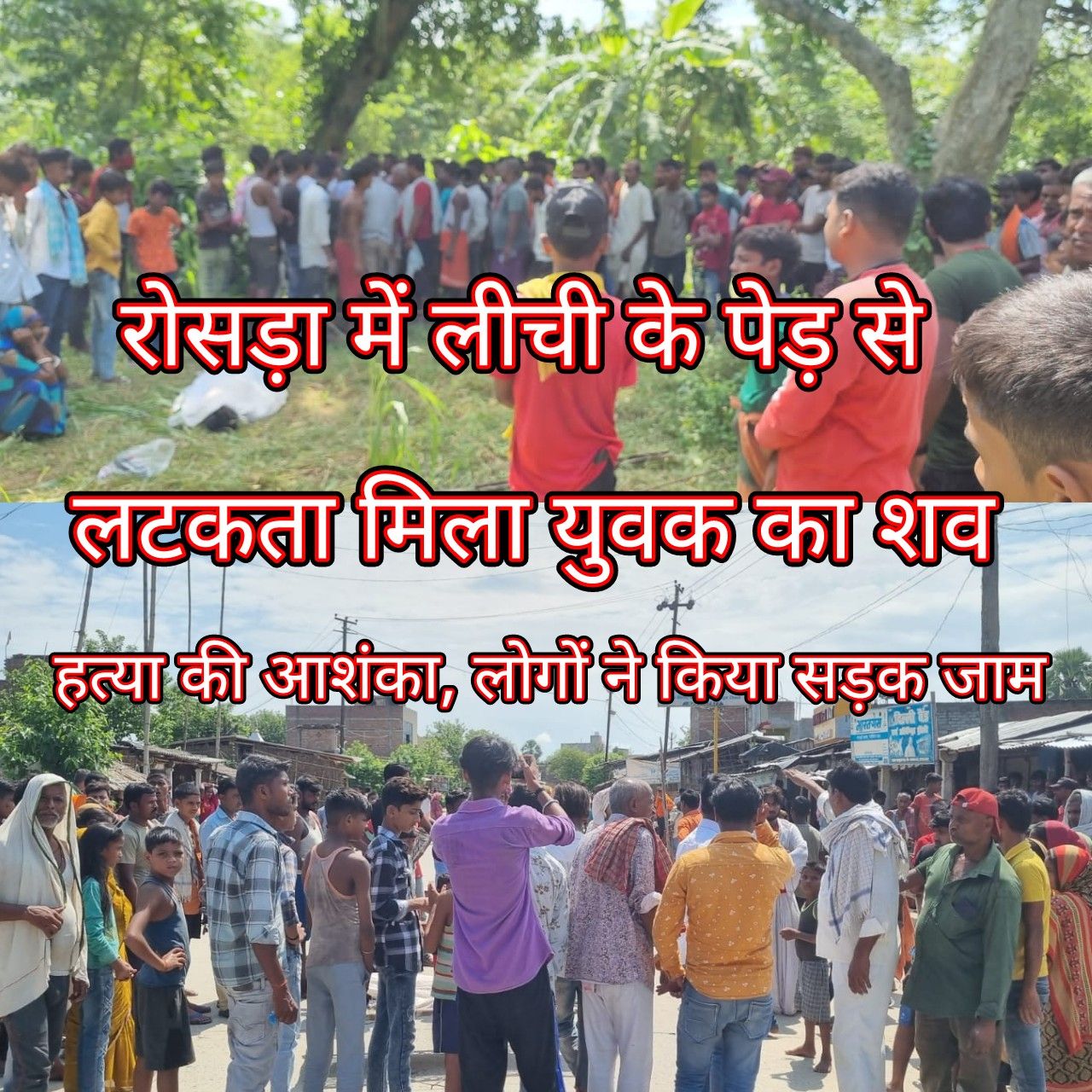 रोसड़ा थाना क्षेत्र के भिरहा पूर्व गांव में एक राजमिस्त्री के पुत्र का शव लीची के पेड़ से लटकता हुआ मिला है। वह रविवार की रात नाच देखने के लिए घर से निकला था। सोमवार की सुबह शव मिलने की सूचना से आसपास के इलाके में सनसनी फैल गयी। काफी संख्या में शव को देखने के लिए स्थानीय लोगों की भीड़ घटनास्थल पर पहुंच गयी। परिजनों में कोहराम मच गया है। परिजन हत्या की आशंका व्यक्त कर रहे हैं। मृत युवक भिरहा पूर्व पंचायत के वार्ड संख्या 12 निवासी पप्पू दास का पुत्र कन्हैया कुमार बताया जाता है। परिजन एवं ग्रामीणों ने रोसड़ा सिंघिया पथ पर हनुमान नगर चौक के समीप सड़क जाम कर दिया है। वे हत्यारों की गिरफ्तारी की मांग कर रहे हैं।